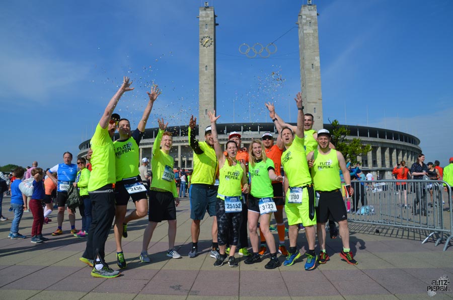 Zu meinem Glück tastet sie sich gerade an die alte Fitness heran und ich konnte mithalten. So liefen wir im Team durch Charlottenburg. Chris trieb uns von hinten an und motivierte gleichzeitig Christian. Ab KM8 musste ich kämpfen nicht langsamer zu werden. Wäre ich allein gelaufen, hätte ich vermutlich das Tempo herausgenommen. Ok, ich wäre wahrscheinlich die ganze Strecke im Wohlfühltempo gelaufen. So zogen Chrissi und ich uns abwechselnd über die letzten beiden Kilometer. Endlich war der Tunnel ins Stadion in Sicht. Die Beine liefen die letzte Runde auf der legendären blauen Tartanbahn wie aufgezogen. Ein gemeinsamer Zieleinlauf, geteilte Freude über die Zeit, über den gemeinsamen Lauf – ein Moment Läuferhimmel! Danke, liebe Chrissi für diesen Lauf. Wer sagt, dass Laufen ein einsamer Sport ist, der kennt die Gemeinschaft der Flitzpiepen (oder manch anderen Läufergruppen – wir wollen mal nicht so sein :D ) nicht!